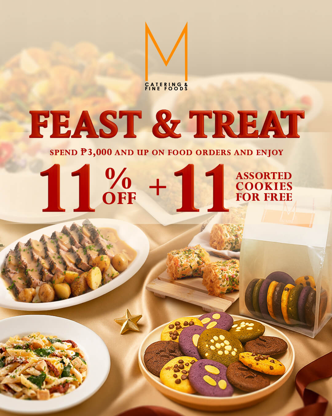 Spend ₱3,000 on any of your favorite food orders and get 11% OFF plus FREE 11 pcs assorted cookies! 🍪